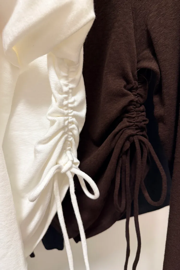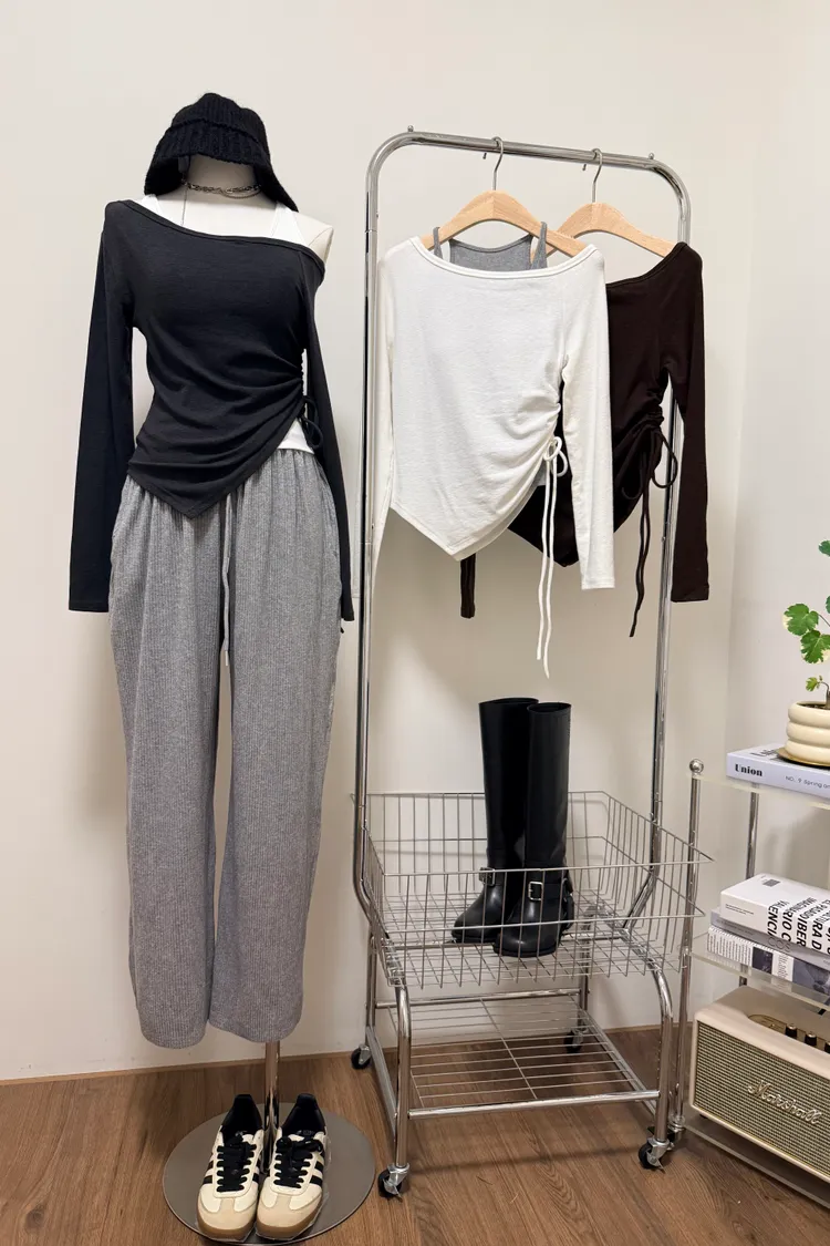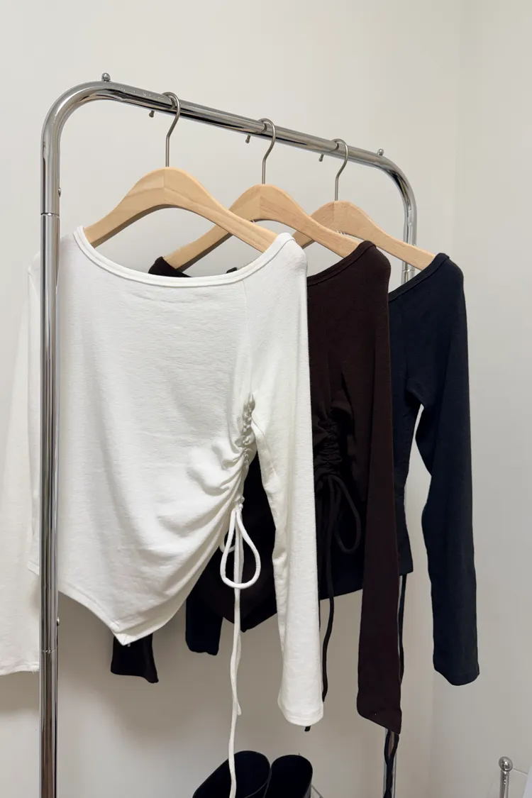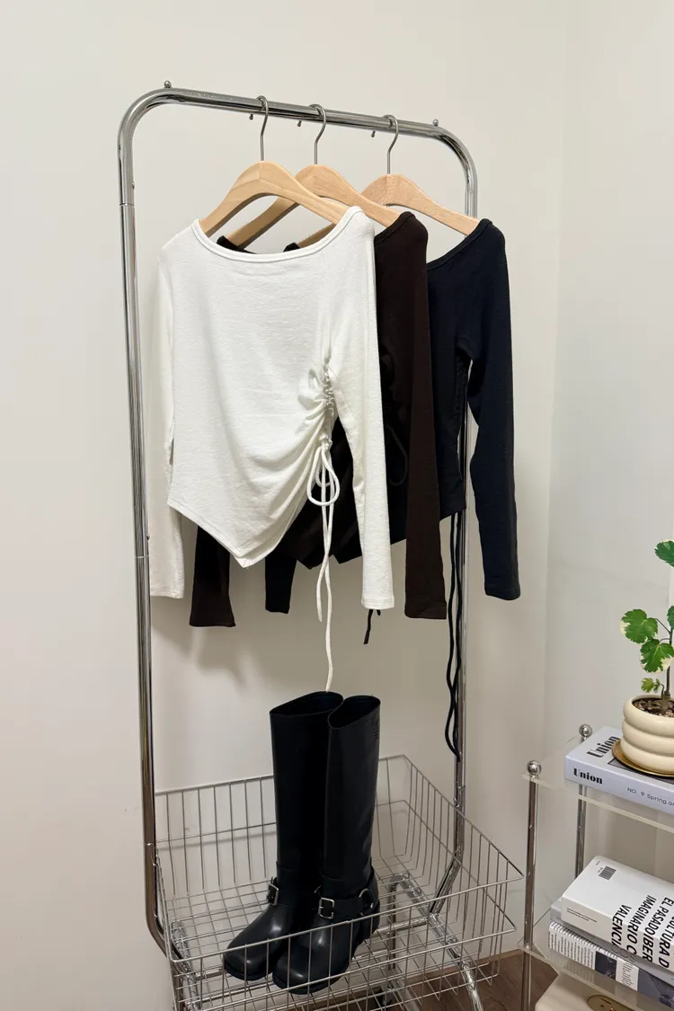 露肩側抓皺長T