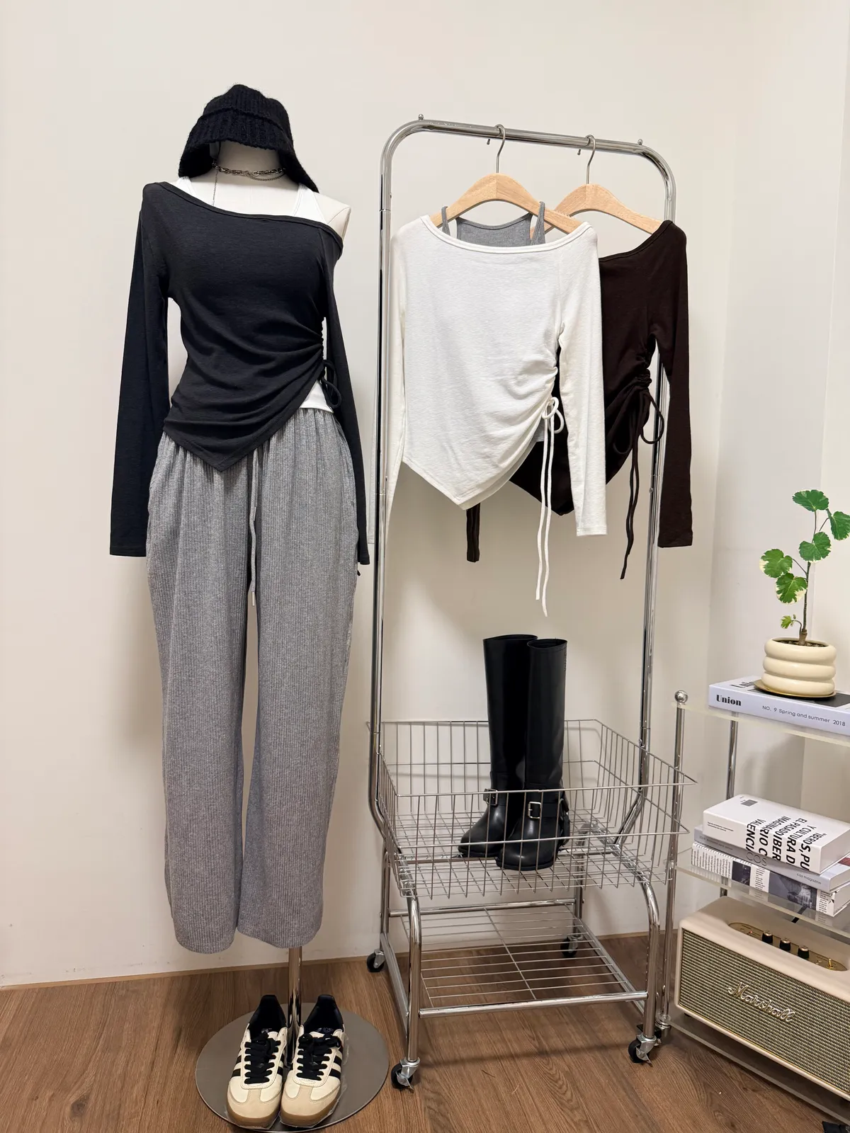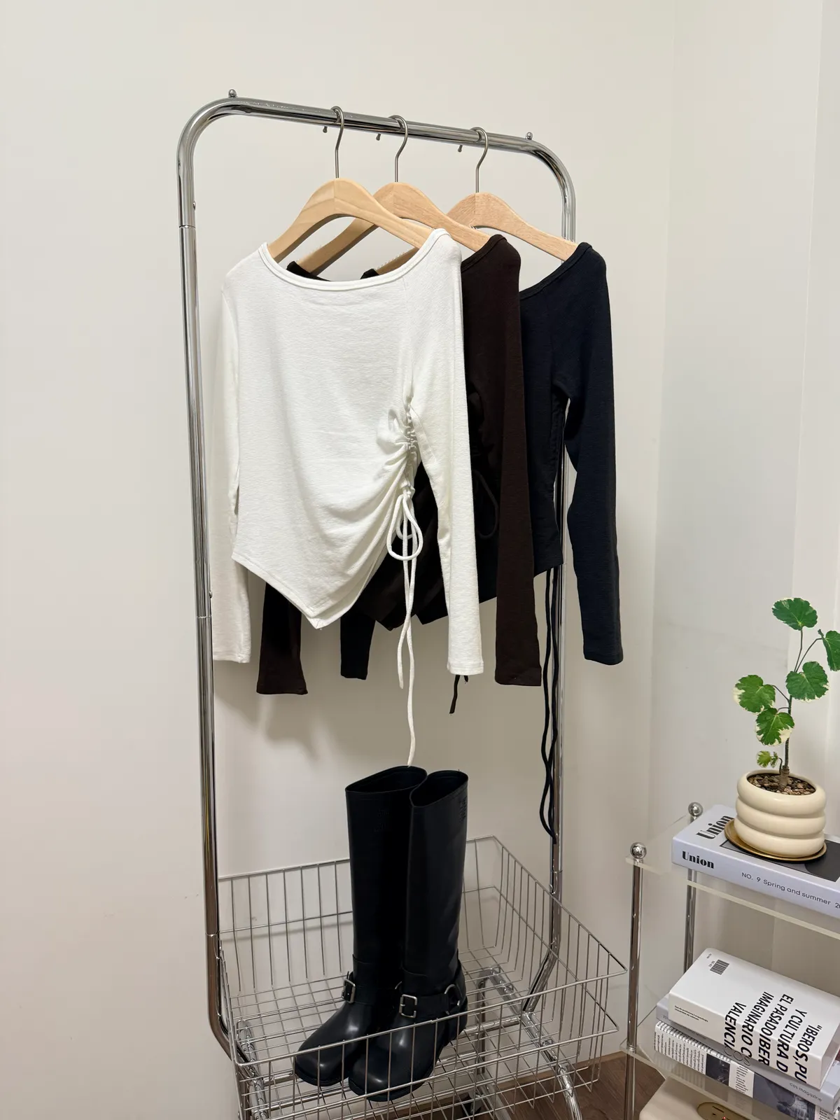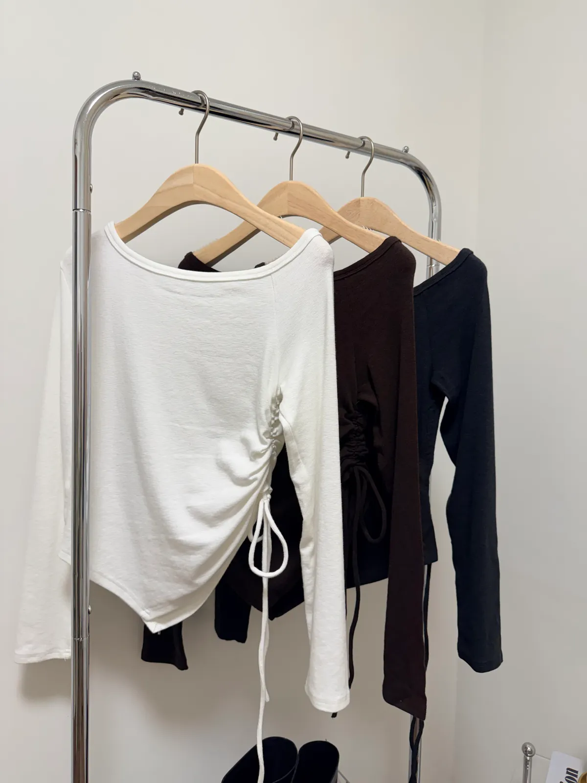 露肩側抓皺長T