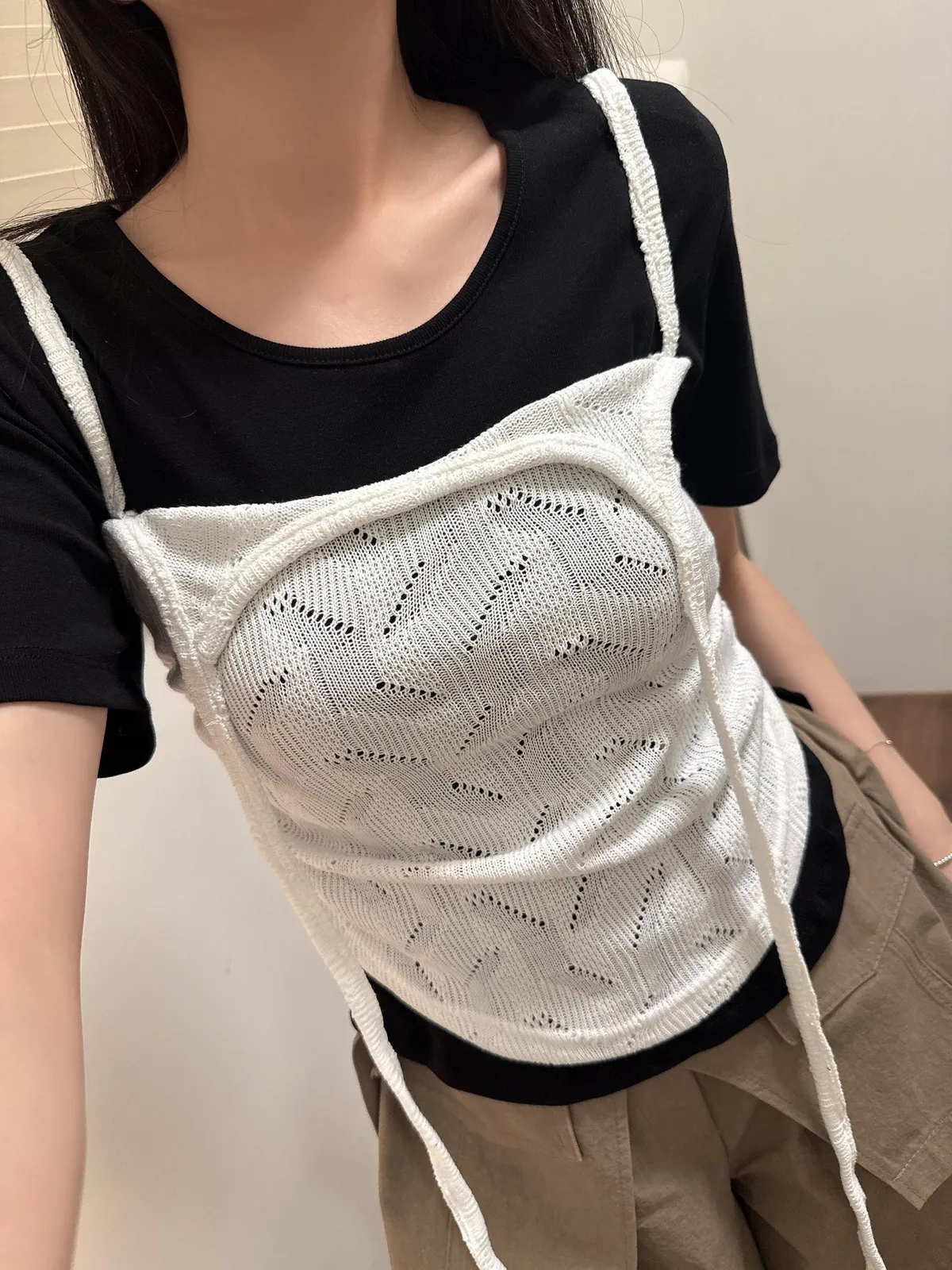 兩件式背心一字領薄長T